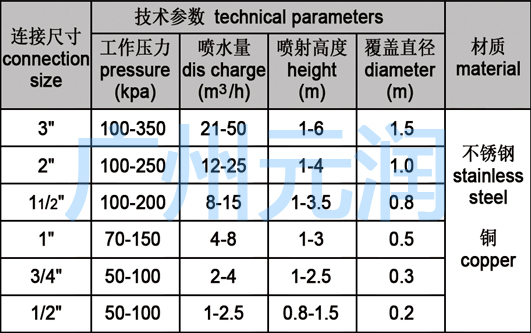 能够喷出雄伟壮观的巨大水柱,抗风能力强,该喷头底部可有可调机构,可适用于不同角度的喷射要求,水柱垂直向上,粗狂挺拔,形似白玉塔,故称冰塔或雪松,配上灯光,显出有金塔、蓝塔、红塔之效果。