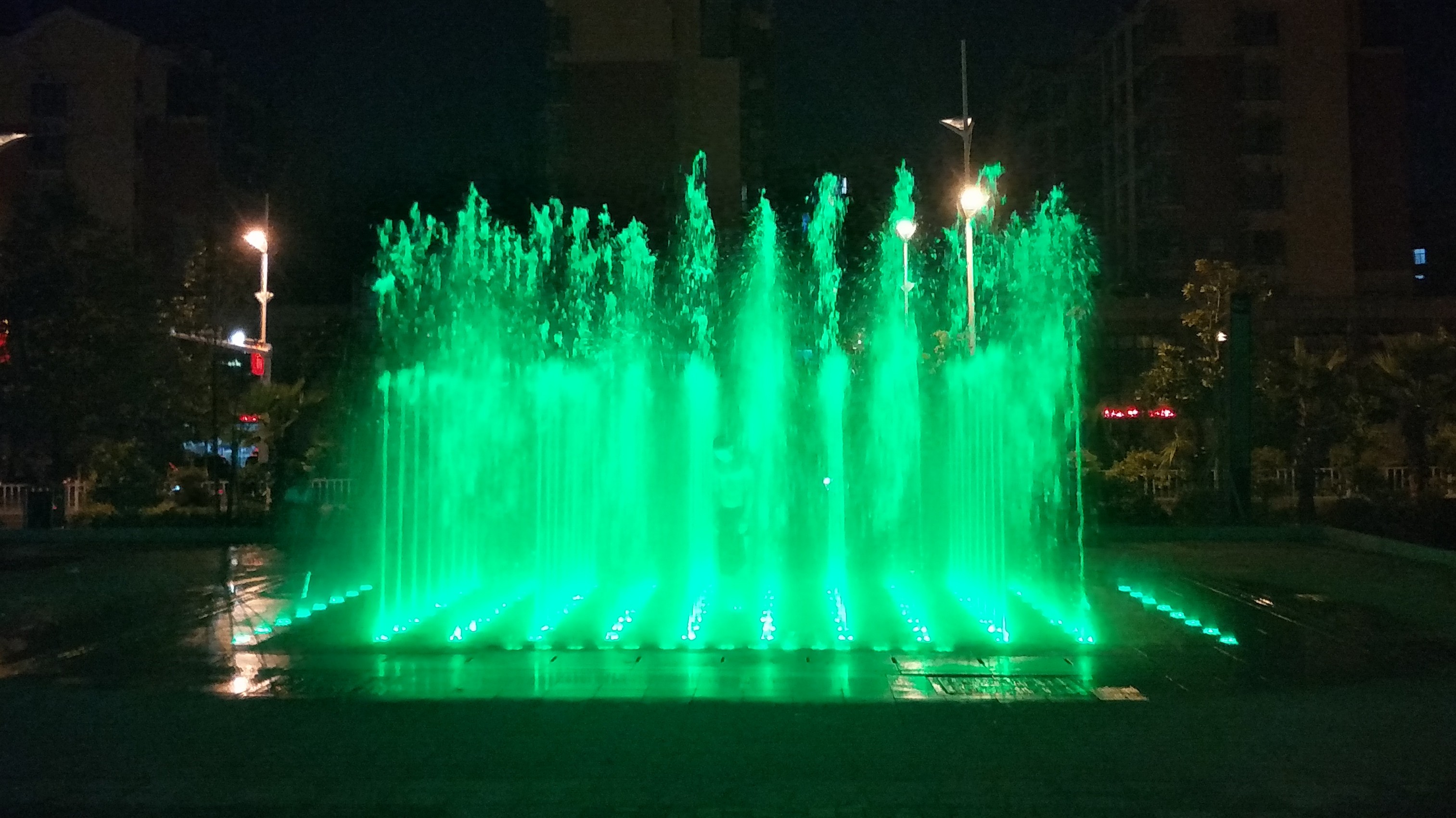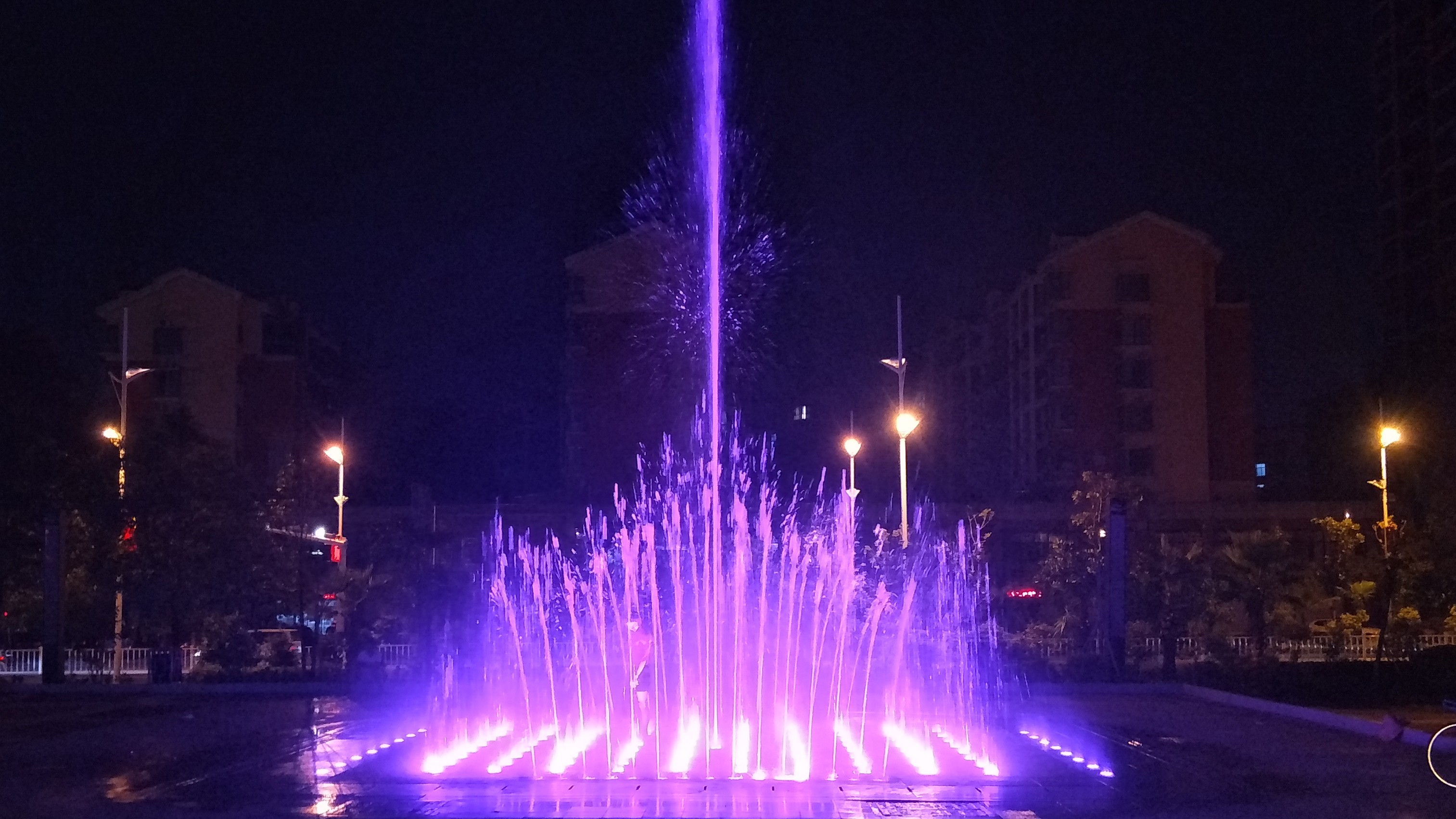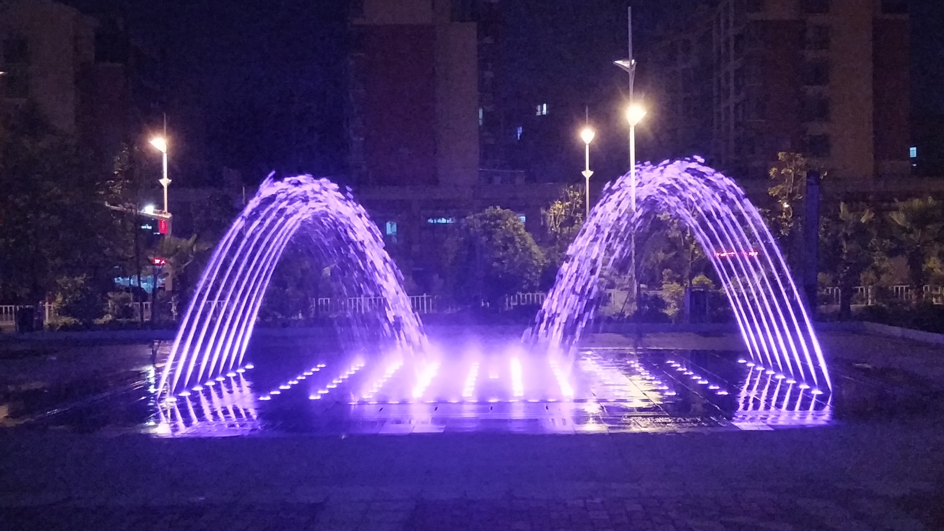音乐喷泉位于项目最繁华的两条道路转角位,音乐喷泉设置水型主要有中心高喷、彩虹对抛、孔雀开屏及追风逐浪水型,中心高喷采用变频控制,喷泉表演时水柱徐徐升起,给人一种积极向上的动态景观,两侧对称设置两组凤尾,喷水时犹如两只美丽的孔雀缓缓开屏。逐风逐浪水型由80个喷头组成,80个喷头根据程序设置多种多样的喷水效果,该水型独立表演效果极佳。