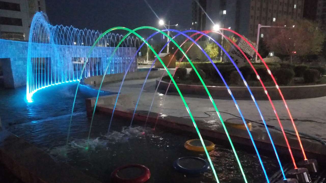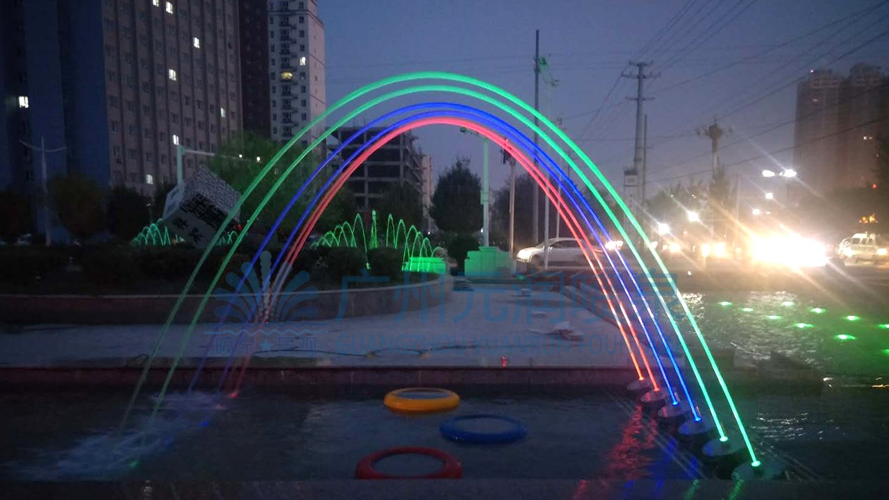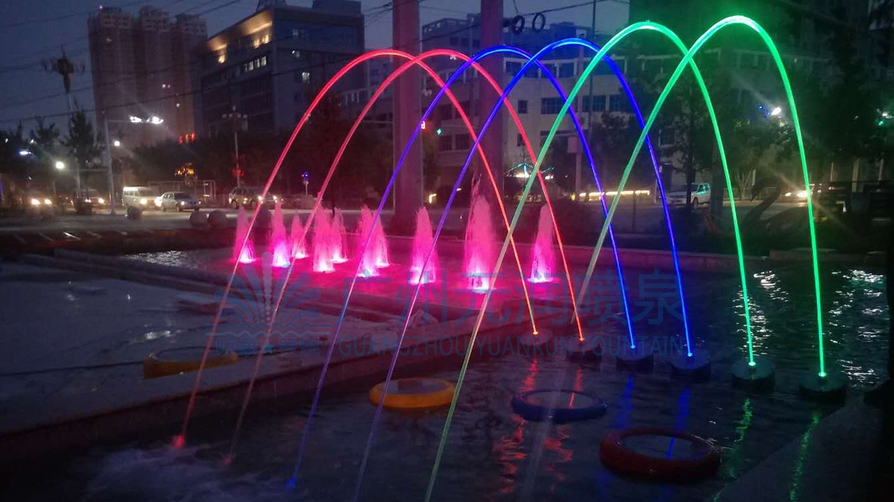 喷泉共设计四种水型,根据场地位置不同分别设置相应水型,从而形成整体高低错落有致、主次分明的喷水景观。远看整体效果极佳,近看各自或独立成景、或与园林景观组合成景。